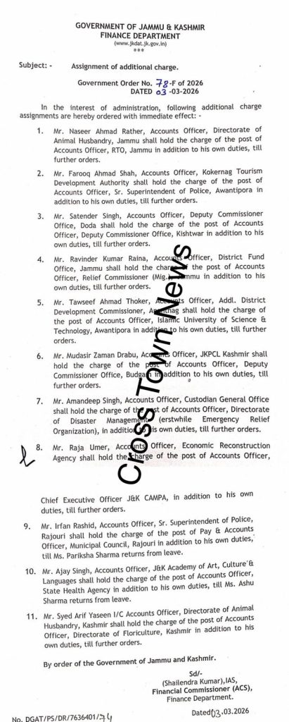 Mar 3: The and Kashmir Government has assigned additional responsibilities to 11 Accounts Officers.