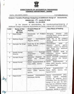 The Directorate of Accounts & Treasuries has issued a fresh transfer and posting order for accountants across various departments in Jammu.