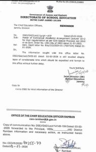 Srinagar, Mar 8: The Directorate of School Education Kashmir (DSEK) has issued a reminder to all Chief Education Officers (CEOs) regarding the matter of regularization of Contractual/Academic Arrangement Lecturers working in 10+2 schools.