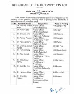 The Directorate of Health Services Kashmir has issued a fresh order regarding the posting of doctors who were awaiting placement in the directorate. As per Order No. 02/GZ of 2026 dated 02 January 2026, the postings have been ordered in the interest of administration and better patient care, with immediate effect.