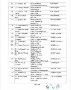 The order includes postings of doctors with various specializations across Community Health Centres, Sub District Hospitals, District Hospitals and Emergency Hospitals in different districts of Kashmir.
