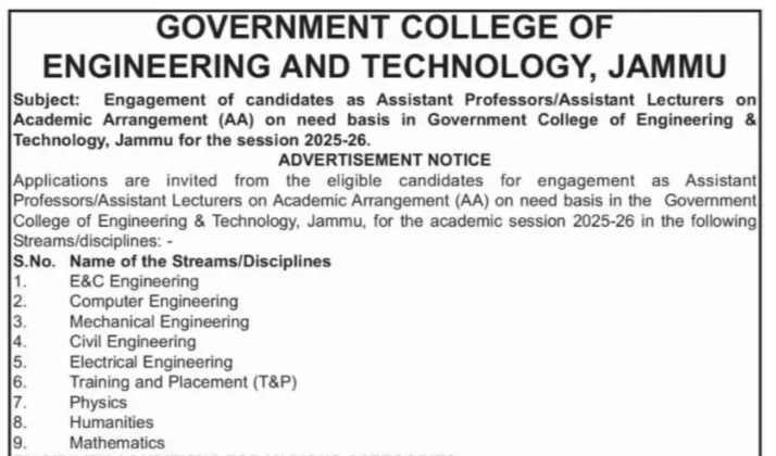 GCET Jammu Recruitment 2025: Apply for Assistant Professor and Lecturer Posts in Engineering and Science DepartmentGovernment College of Engineering and Technology (GCET), Jammu, has announced a recruitment notification for the engagement of Assistant Professors and Assistant Lecturers for the academic session 2025–26. The appointments will be made on an academic arrangement basis, purely temporary and need-based.