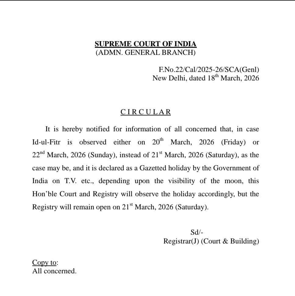 If Eid-ul-Fitr is celebrated on March 20, 2026 (Friday) or March 22, 2026 (Sunday) instead of March 21, 2026 (Saturday), the Hon’ble Supreme Court and its Registry will observe the holiday accordingly.