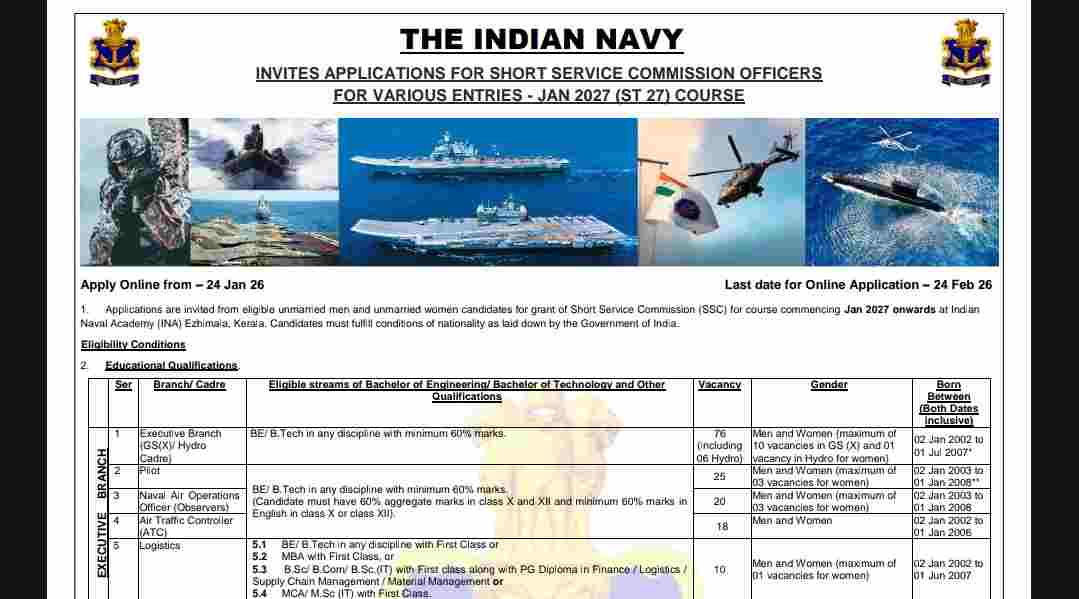 The Indian Navy Recruitment 2026 has been officially announced for Short Service Commission (SSC) Officers, offering a total of 260 posts across various branches. Eligible candidates can apply online for positions in Executive, Pilot, Naval Air Operations, Air Traffic Controller (ATC), Logistics, Education, Engineering, Submarine, and Electrical branches. This is an excellent opportunity for young professionals to serve the nation while building a rewarding career.