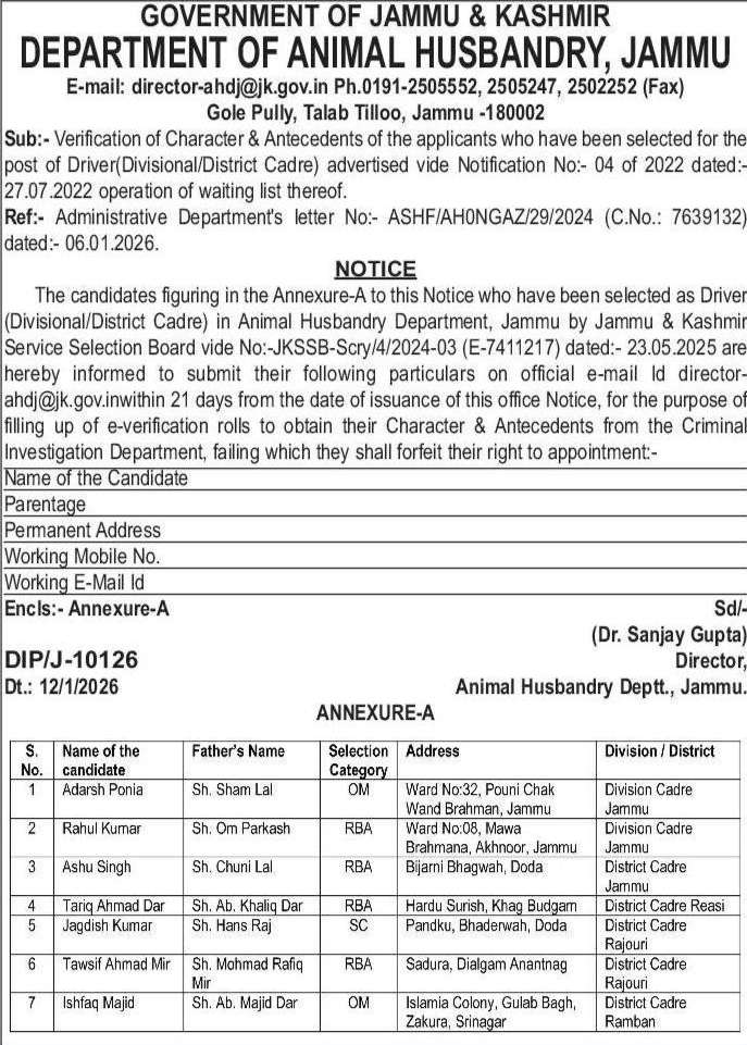 The Department of Animal Husbandry, Jammu has issued an official notice regarding the operation of the waiting list and verification of character and antecedents for candidates selected to the post of Driver (Divisional/District Cadre).