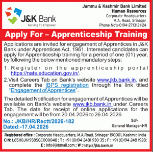 J&K Bank Recruitment 2026 Notification : has released a notification inviting online applications for engagement of Apprentices under the National Apprenticeship Training Scheme (NATS). The recruitment will be conducted as per the Apprentices Act, 1961 for a duration of one year.
