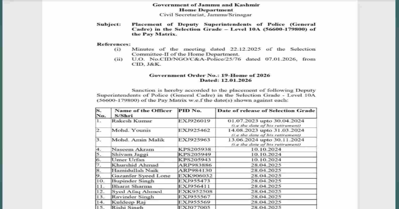 The Government of Jammu and Kashmir, Home Department, has issued an official order regarding the placement of Deputy Superintendents of Police (General Cadre) in the Selection Grade – Level 10A (₹56,600–1,79,800) of the Pay Matrix. The order has been issued following the recommendations of the Selection Committee and approvals from the competent authority.