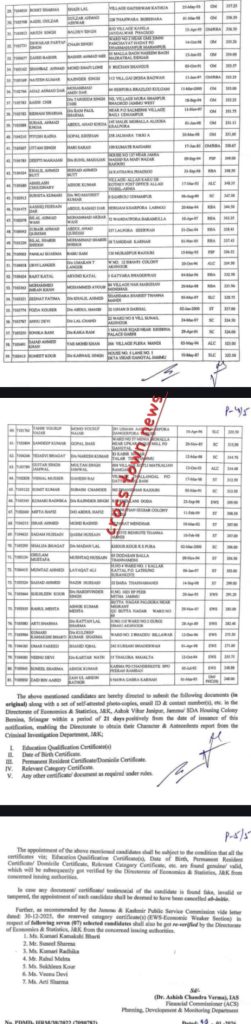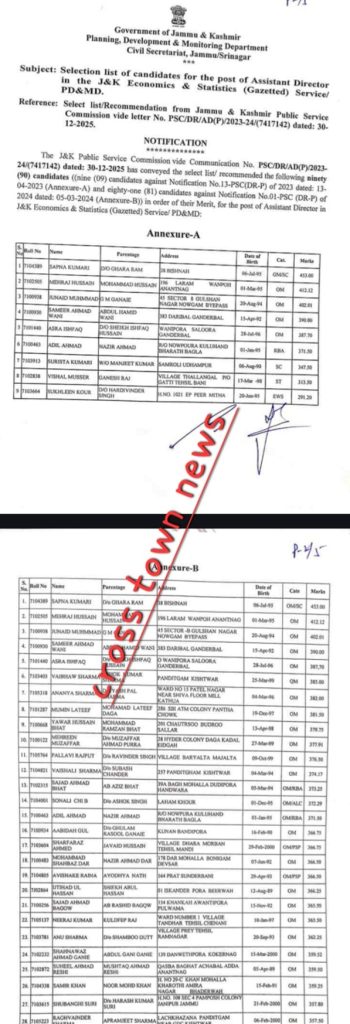 Feb 07: J&K Govt notified selection list of 91 Assistant Directors, details with CTN read as under: