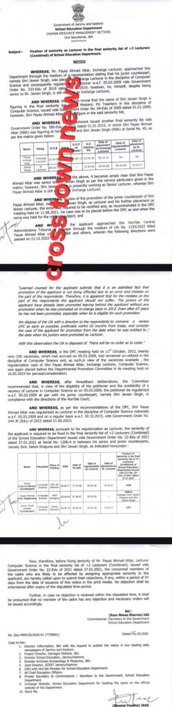 The Jammu and Kashmir Government has issued an order on March 21 directing the fixation of seniority for Lecturers in the School Education Department.