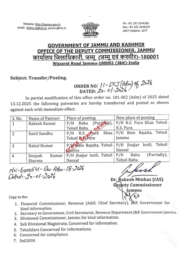 J&K Govt orders transfers/postings of Patwaris