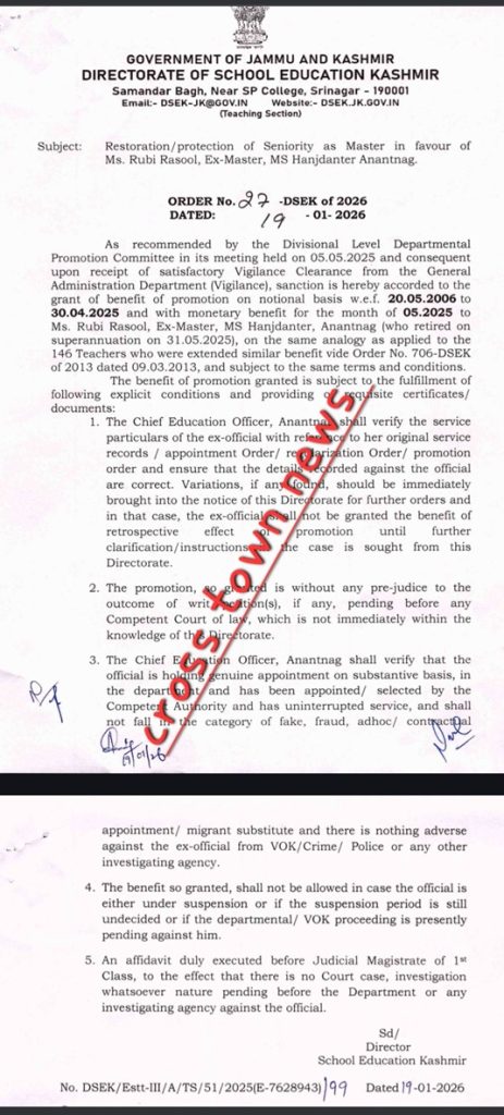 J&K Govt sanctioned promotion of Ex Master w.e.f. 20.05.2006 January 21, 2026 by By Times of Kashmir News Desk Follow our WhatsApp Channel for instant updates — Join Now Jammu, Jan 20: J&K Govt sanctioned promotion of Ex Master w.e.f. 20.05.2006. Order copy with times of kashmir reads as: