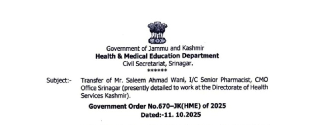 Srinagar, October 12: In a significant administrative move, the Government of Jammu and Kashmir’s Health & Medical Education Department has issued immediate transfer orders for a senior pharmacist stationed in Srinagar.
