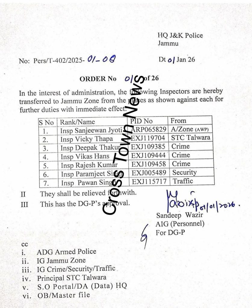 Jammu and Kashmir Police ordered transfers of 7 Inspectors.