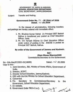 As per Government Order No. 54-JK (Edu) of 2026 dated February 2, 2026, Mr. Bhushan Kumar Pathak, who was serving as In-Charge Principal DIET Basholi, Kathua, has been transferred and posted as Chief Education Officer, Doda.