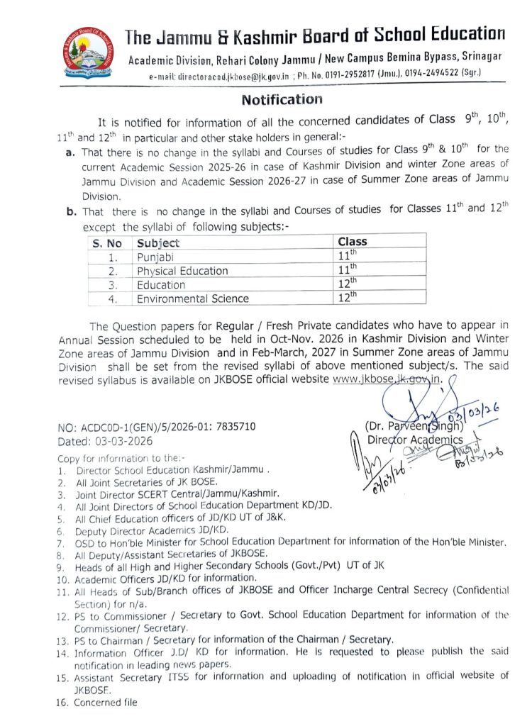 According to the notification, there will be no change in the syllabi for Classes 9th and 10th for the Academic Session 2025–26 in Kashmir Division and Winter Zone areas of Jammu Division, and for the Academic Session 2026–27 in Summer Zone areas of Jammu Division.