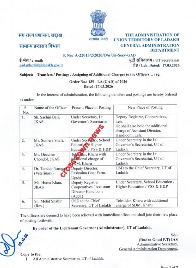 Such administrative changes are regularly undertaken to enhance coordination, streamline operations, and address evolving governance needs in Ladakh. Readers are advised to check the full order below for complete details of postings and transfers.