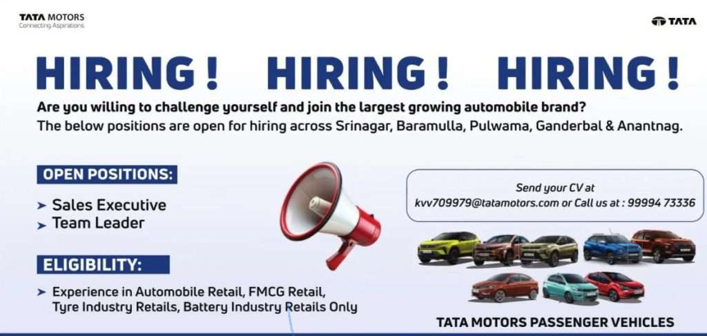 Tata Motors is looking for dynamic professionals eager to excel in sales and leadership roles across Kashmir. Don’t wait — send your CV to kvv709979@tatamotors.com or call 99994 73336 to seize this opportunity today!